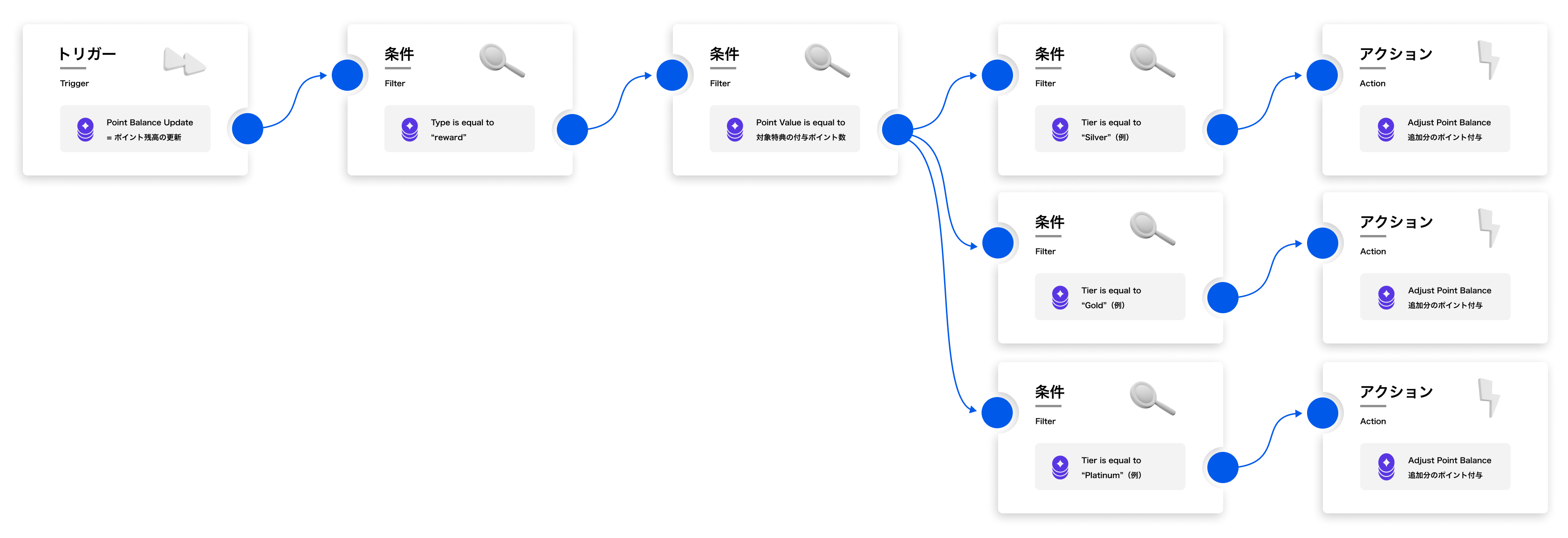 こちらのFlowでは全ての特典によるポイント付与に固定のポイント数を加算しているため、繰り返し受け取りやすい特典(ログイン特典、レビュー特典など)がある場合は注意が必要になります。